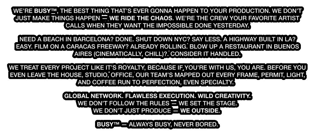We’re BUSY™, the best thing that’s ever gonna happen to your production. We don’t just make things happen — we ride the chaos. We’re the crew your favorite artist calls when they want the impossible done yesterday.